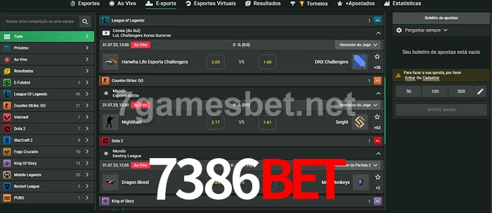 O 7386Bet oferece uma grande seleção de opções de apostas em e-sports com probabilidades competitivas